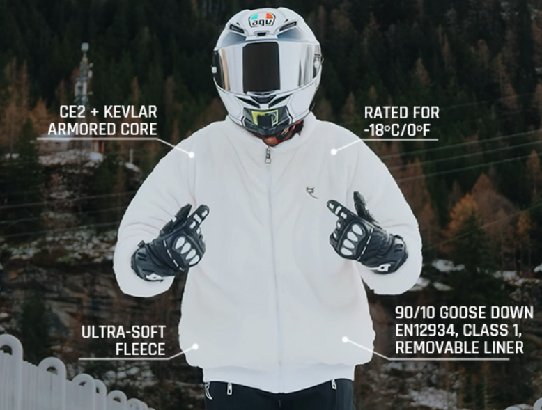 AURORA is arctic luxury for winter in motion—clean, elevated, and deliberate—made to stay quiet and deliver loud results. Cut from a premium soft fleece shell, AURORA combines a multi-layer thermal system with 90/10 goose down insulation (650FP)—lightweight, high-loft, and responsibly sourced under RDS compliance. Protection is integrated into the foundation: CE Level 2 armor at the shoulders, elbows, and back, backed by 100% DuPont™ Kevlar® in all high-impact zones for confidence where it matters most. A removable zipper liner and thoughtful layered construction make AURORA versatile across seasons. Designed for cold mornings, late nights, and everyday movement through the city—ideal for early spring, late fall, and mild winter conditions—where control, comfort, and presence matter most.