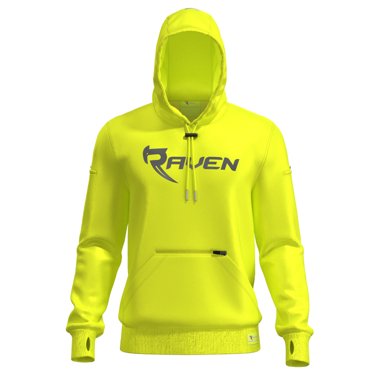 Reflective logos for increased visibility. Extra total length and thumb loops to keep the hoodie from sliding up in the event of an accident.
