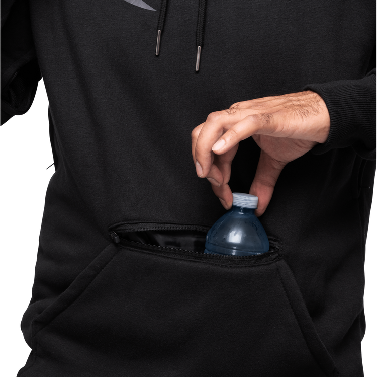 A massive center zip pocket, big enough for two water bottles! Side velcro pockets on both arms for wallet or phone.
