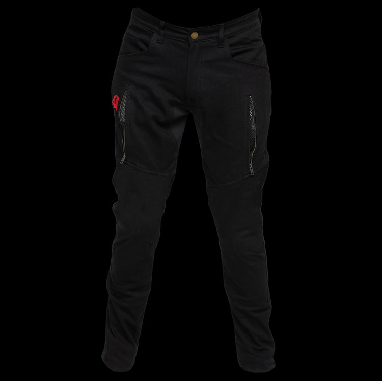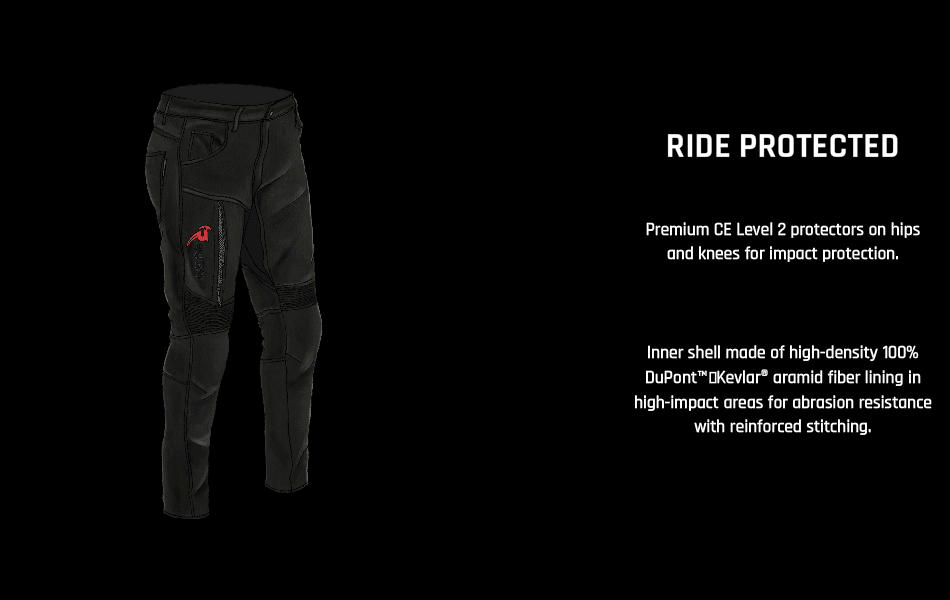 ONYX is the blackout armor your ride deserves. 100% DuPont™ Kevlar® in high-impact zones. CE Level 2 protection at hips and knees.